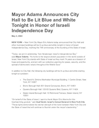 New York City Mayor Eric Adams announces that City Hall and other municipal buildings will be lit up blue and white tonight in honor of Israeli Independence Day.
