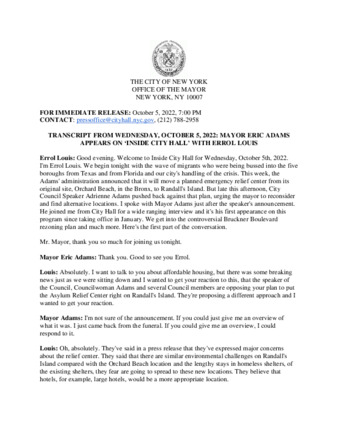 TRANSCRIPT FROM WEDNESDAY, OCTOBER 5, 2022: MAYOR ERIC ADAMS APPEARS ON ‘INSIDE CITY HALL’ WITH ERROL LOUIS