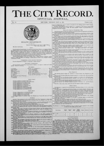 The City Record newspaper publishes notices which includes but is not limited to: public hearings and meetings, public auctions and sales, solicitations and awards and official rules proposed and adopted by city agencies. This is the City Record Newspaper for May 12, 1881.