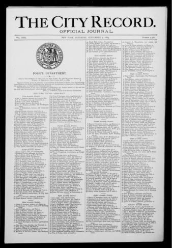 The City Record newspaper publishes notices which includes but is not limited to: public hearings and meetings, public auctions and sales, solicitations and awards and official rules proposed and adopted by city agencies. This is the City Record Newspaper for September 07, 1889.