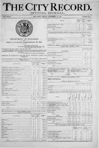 The City Record newspaper publishes notices which includes but is not limited to: public hearings and meetings, public auctions and sales, solicitations and awards and official rules proposed and adopted by city agencies. This is the City Record Newspaper for November 16, 1900.