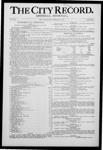 The City Record newspaper publishes notices which includes but is not limited to: public hearings and meetings, public auctions and sales, solicitations and awards and official rules proposed and adopted by city agencies. This is the City Record Newspaper for February 24, 1902.
