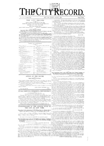 The City Record newspaper publishes notices which includes but is not limited to: public hearings and meetings, public auctions and sales, solicitations and awards and official rules proposed and adopted by city agencies. This is the City Record Newspaper for August 01, 1916.