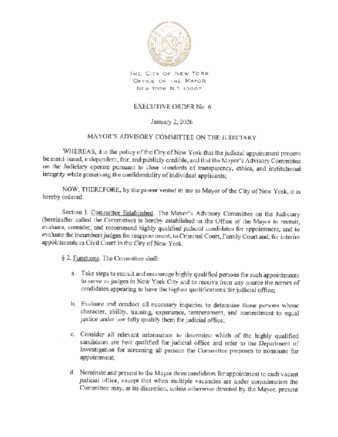 Executive Order No. 6 is being submitted as it relates to the Mayor's Advisory Committee on the Judiciary, dated January 2, 2026; shall take effect immediately.