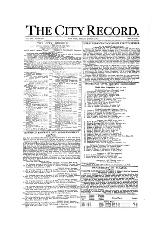 The City Record newspaper publishes notices which includes but is not limited to: public hearings and meetings, public auctions and sales, solicitations and awards and official rules proposed and adopted by city agencies. This is the City Record Newspaper for March 05, 1917.