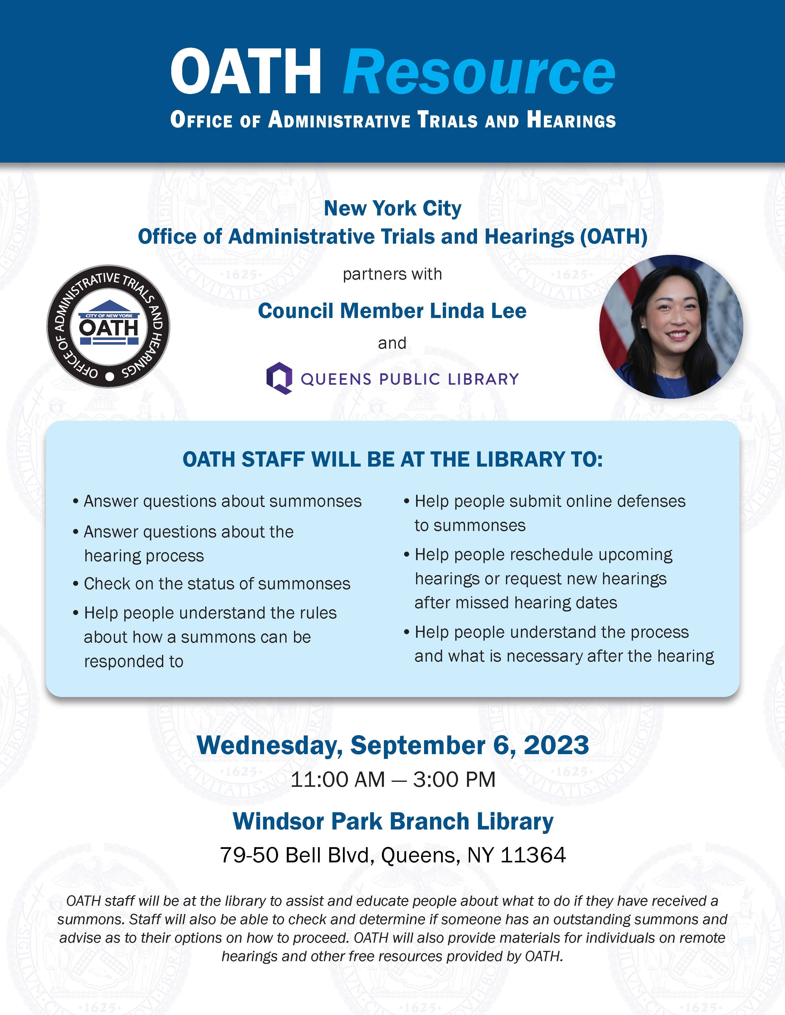 OATH staff were at the library to assist and educate people about what to do should they have received a summons and to check to determine if someone has an outstanding summons. Materials about remote hearings and other free resources were provided to the public as well.