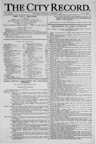 The City Record newspaper publishes notices which includes but is not limited to: public hearings and meetings, public auctions and sales, solicitations and awards and official rules proposed and adopted by city agencies. This is the City Record Newspaper for November 11, 1908.