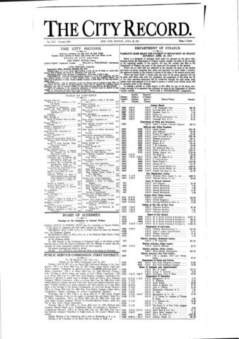 The City Record newspaper publishes notices which includes but is not limited to: public hearings and meetings, public auctions and sales, solicitations and awards and official rules proposed and adopted by city agencies. This is the City Record Newspaper for April 30, 1917.