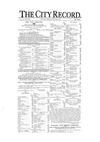 The City Record newspaper publishes notices which includes but is not limited to: public hearings and meetings, public auctions and sales, solicitations and awards and official rules proposed and adopted by city agencies. This is the City Record Newspaper for September 18, 1918.