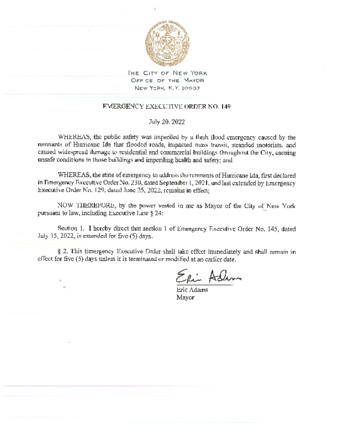 Emergency Executive Order No. 149, extends Emergency Executive Order No. 145, dated July 15, 2022, for five (5) days, if this relates to Hurricane Ida.
