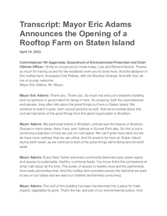 A transcript about Mayor Eric Adams announcing the opening of a rooftop farm on Staten Island alongside New York Department of Environment Protection (DEP) Commissioner Rohit T. Aggarwala.