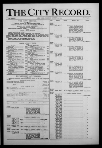 The City Record newspaper publishes notices which includes but is not limited to: public hearings and meetings, public auctions and sales, solicitations and awards and official rules proposed and adopted by city agencies. This is the City Record Newspaper for August 22, 1905.