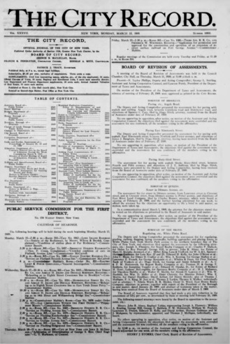 The City Record newspaper publishes notices which includes but is not limited to: public hearings and meetings, public auctions and sales, solicitations and awards and official rules proposed and adopted by city agencies. This is the City Record Newspaper for March 15, 1909.