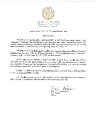 Emergency Executive Order No. 404, is being submitted to extend Emergency Executive Order No. 400, dated May 5, 2023, for five (5) days, if this relates to Hurricane Ida.