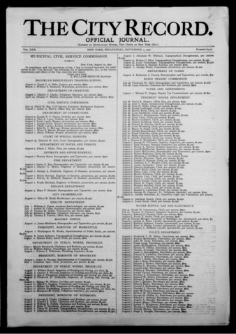 The City Record newspaper publishes notices which includes but is not limited to: public hearings and meetings, public auctions and sales, solicitations and awards and official rules proposed and adopted by city agencies. This is the City Record Newspaper for September 03, 1902.
