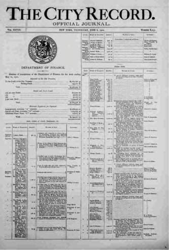The City Record newspaper publishes notices which includes but is not limited to: public hearings and meetings, public auctions and sales, solicitations and awards and official rules proposed and adopted by city agencies. This is the City Record Newspaper for June 06, 1900.