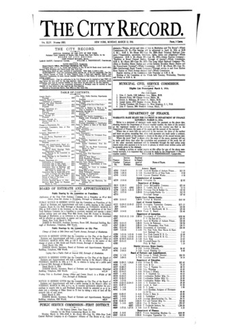 The City Record newspaper publishes notices which includes but is not limited to: public hearings and meetings, public auctions and sales, solicitations and awards and official rules proposed and adopted by city agencies. This is the City Record Newspaper for March 13, 1916.