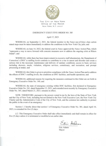 Emergency Executive Order No. 385, is being submitted to extend Emergency Executive Order No. 381, dated April 10, 2023, for five (5) days, if this relates to Rikers.