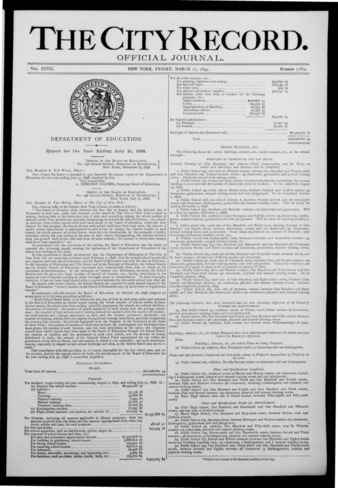 The City Record newspaper publishes notices which includes but is not limited to: public hearings and meetings, public auctions and sales, solicitations and awards and official rules proposed and adopted by city agencies. This is the City Record Newspaper for March 17, 1899.