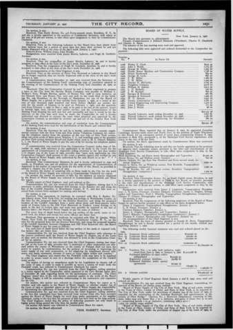 The City Record newspaper publishes notices which includes but is not limited to: public hearings and meetings, public auctions and sales, solicitations and awards and official rules proposed and adopted by city agencies. This is the Supplement to the City Record Newspaper for January 31, 1907.