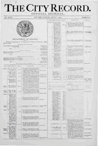 The City Record newspaper publishes notices which includes but is not limited to: public hearings and meetings, public auctions and sales, solicitations and awards and official rules proposed and adopted by city agencies. This is the City Record Newspaper for August 04, 1900.