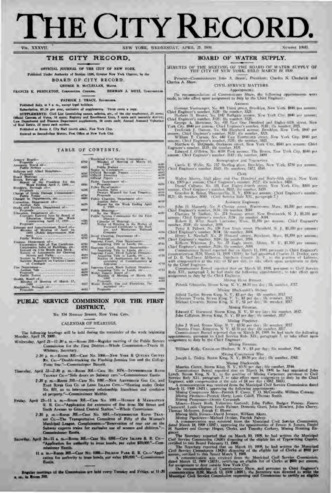 The City Record newspaper publishes notices which includes but is not limited to: public hearings and meetings, public auctions and sales, solicitations and awards and official rules proposed and adopted by city agencies. This is the City Record Newspaper for April 21, 1909.