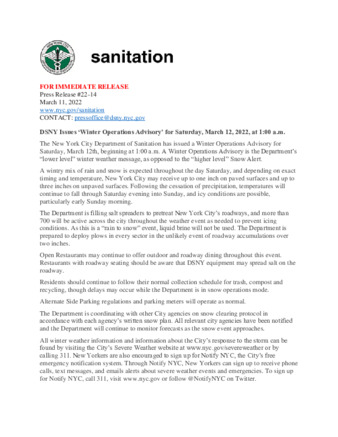 - DSNY Issues ‘Winter Operations Advisory’ for Saturday, March 12, 2022, at 1:00 a.m.