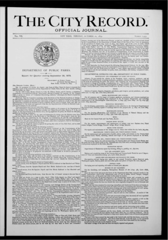 The City Record newspaper publishes notices which includes but is not limited to: public hearings and meetings, public auctions and sales, solicitations and awards and official rules proposed and adopted by city agencies. This is the City Record Newspaper for October 21, 1879.