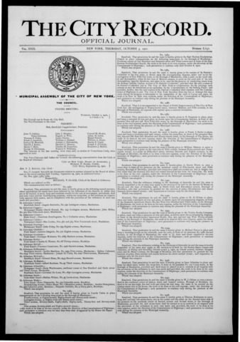 The City Record newspaper publishes notices which includes but is not limited to: public hearings and meetings, public auctions and sales, solicitations and awards and official rules proposed and adopted by city agencies. This is the City Record Newspaper for October 03, 1901.