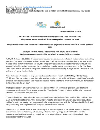 Mayor's Press Release: NYC-Based Children’s Health Fund Responds to Lead Crisis in Flint; Dispatches Iconic Medical Clinic to Help Kids Exposed to Lea