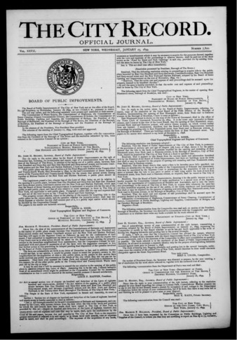 The City Record newspaper publishes notices which includes but is not limited to: public hearings and meetings, public auctions and sales, solicitations and awards and official rules proposed and adopted by city agencies. This is the City Record Newspaper for January 25, 1899.