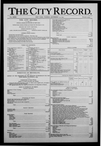 The City Record newspaper publishes notices which includes but is not limited to: public hearings and meetings, public auctions and sales, solicitations and awards and official rules proposed and adopted by city agencies. This is the City Record Newspaper for September 13, 1904.