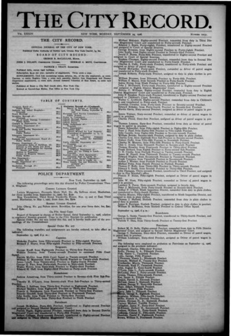 The City Record newspaper publishes notices which includes but is not limited to: public hearings and meetings, public auctions and sales, solicitations and awards and official rules proposed and adopted by city agencies. This is the City Record Newspaper for September 24, 1906.