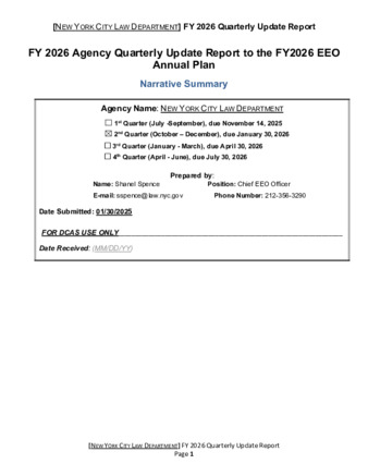 The Law Department's Quarter 2, Fiscal Year 2026 Report highlights employee recognition awards and appreciation events. It also outlines initiatives planned and implemented in accordance with LAW's Annual EEO Plan.