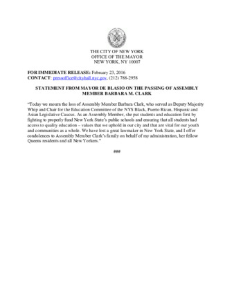 Mayor's Press Release: STATEMENT FROM MAYOR DE BLASIO ON THE PASSING OF ASSEMBLY MEMBER BARBARA M. CLARK
