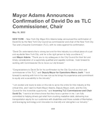 New York City Mayor Eric Adams announces the confirmation of David Do by the New York City Council as commissioner and chair of the New York City Taxi and Limousine Commission (TLC).