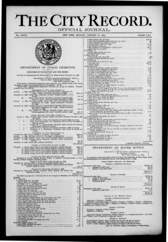 The City Record newspaper publishes notices which includes but is not limited to: public hearings and meetings, public auctions and sales, solicitations and awards and official rules proposed and adopted by city agencies. This is the City Record Newspaper for January 16, 1899.