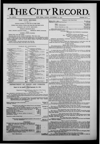 The City Record newspaper publishes notices which includes but is not limited to: public hearings and meetings, public auctions and sales, solicitations and awards and official rules proposed and adopted by city agencies. This is the City Record Newspaper for December 23, 1904.