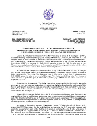 QUEENS MAN PLEADS GUILTY TO ACCEPTING OVER $3,000 FROM TWO UNDERCOVER DOI INVESTIGATORS POSING AS TLC LICENSE CANDIDATES