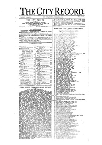 The City Record newspaper publishes notices which includes but is not limited to: public hearings and meetings, public auctions and sales, solicitations and awards and official rules proposed and adopted by city agencies. This is the City Record Newspaper for December 20, 1915.