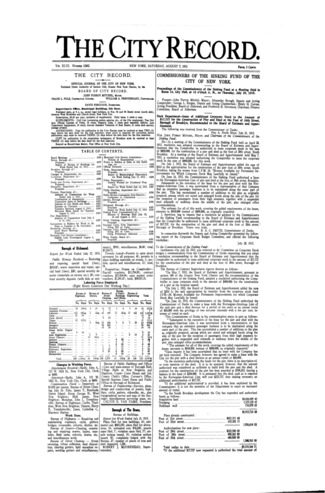 The City Record newspaper publishes notices which includes but is not limited to: public hearings and meetings, public auctions and sales, solicitations and awards and official rules proposed and adopted by city agencies. This is the City Record Newspaper for August 07, 1915.