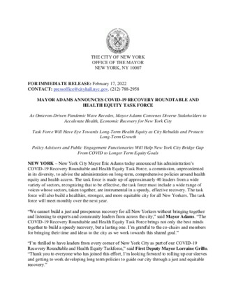 New York City Mayor Eric Adams announces his administration’s COVID-19 Recovery Roundtable and Health Equity Task Force.