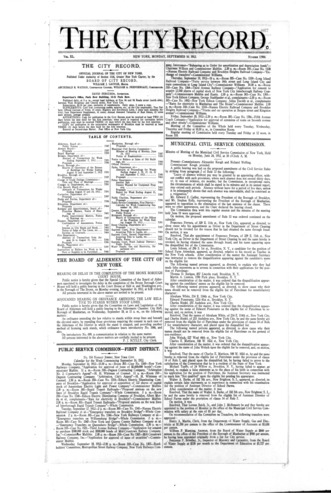 The City Record newspaper publishes notices which includes but is not limited to: public hearings and meetings, public auctions and sales, solicitations and awards and official rules proposed and adopted by city agencies. This is the City Record Newspaper for September 16, 1912.