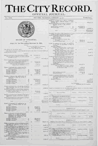 The City Record newspaper publishes notices which includes but is not limited to: public hearings and meetings, public auctions and sales, solicitations and awards and official rules proposed and adopted by city agencies. This is the City Record Newspaper for February 13, 1901.