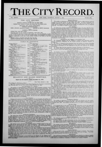 The City Record newspaper publishes notices which includes but is not limited to: public hearings and meetings, public auctions and sales, solicitations and awards and official rules proposed and adopted by city agencies. This is the City Record Newspaper for August 03, 1905.