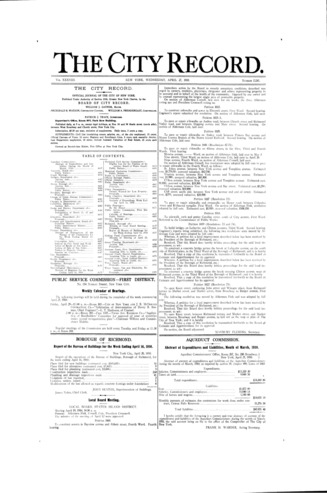 The City Record newspaper publishes notices which includes but is not limited to: public hearings and meetings, public auctions and sales, solicitations and awards and official rules proposed and adopted by city agencies. This is the City Record Newspaper for April 27, 1910.