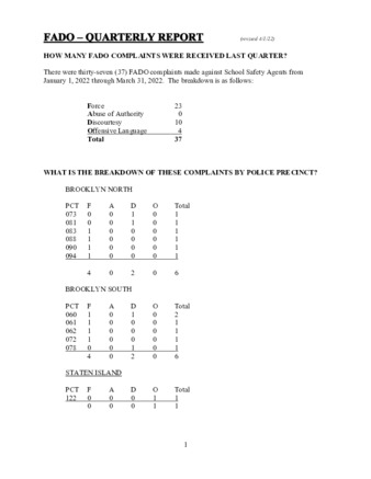PURSUANT TO ADMIN CODE SECT 14-150, THIS QUARTERLY REPORT CONTAINS SSA REPORT DISAGGREGATED BY PRECINCT, SSA REPORT DISAGGREGATED BY SCHOOL, FADO REPORT, AND SSD REPORT DETAILING THE NUMBER OF NJURIES TO DEPT PERSONNEL FROM STUDENT MISCONDUCT