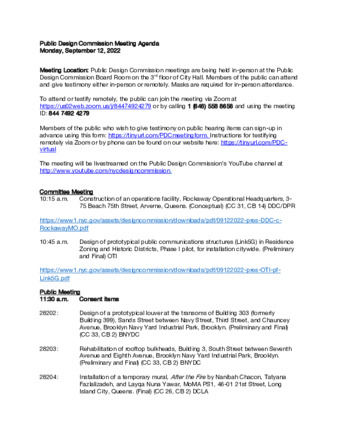 The Public Design Commission meets once a month. The meeting agendas are posted online three business days in advance of each meeting and published in the City Record. Agendas are also distributed to all City Council members, Community Boards, and City agency liaisons.