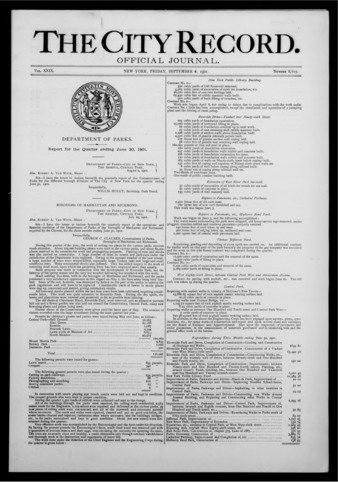 The City Record newspaper publishes notices which includes but is not limited to: public hearings and meetings, public auctions and sales, solicitations and awards and official rules proposed and adopted by city agencies. This is the City Record Newspaper for September 06, 1901.