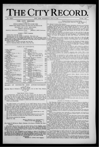 The City Record newspaper publishes notices which includes but is not limited to: public hearings and meetings, public auctions and sales, solicitations and awards and official rules proposed and adopted by city agencies. This is the City Record Newspaper for July 10, 1907.